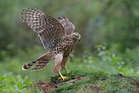 Jong vrouwtje Havik met de vleugels gespreid staand tussen het hoge gras op een open plek in een bos met de zacht groene kleuren van vegetatie in de achtergrond.