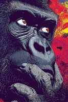 Deze krachtige popart-illustratie toont een gorilla in een moment van diepe contemplatie, met zijn hand bedachtzaam tegen zijn mond en een peinzende blik in de ogen. De expressieve lijnen in het gezicht worden versterkt door de levendige achtergrond van rood, geel en blauw in grafische dotpatronen. De combinatie van krachtige anatomie en een bijna filosofische houding geeft dit werk een intrigerende balans tussen kracht en kwetsbaarheid. Ideaal voor liefhebbers van moderne dierportretten met een intellectuele of introspectieve lading.