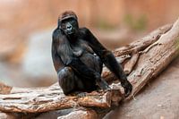 een gorilla moeder zittend op een boomstam