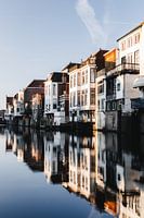 De huizen aan de Langendijk in Gorinchem met weerspiegeling in het water. Het mooiste vestingstadje van Nederland. Foto vanaf de Visbrug, uitzicht op de Lingehaven.
