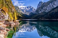 Het Dachstein-gebergte met de Dachstein-gletsjer wordt weerspiegeld in het herfstige Gosau-meer in de Oostenrijkse regio Salzkammergut