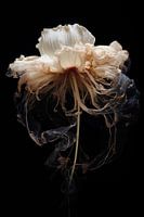 De vergane glorie van een ooit levendige bloem wordt opnieuw geïnterpreteerd in een gotisch barokke esthetiek. De kwallenvorm onthult de prachtige details van het verwelkte leven, gevangen in een tijdloos kunstwerk voor aan de muur.