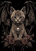 Een mystieke kat in gotische stijl met vleermuisvleugels, omringd door rozen en met een doodshoofd hanger aan zijn kraag. De donkere, gedetailleerde afbeelding combineert schattigheid met een donkere, mysterieuze sfeer en geeft de afbeelding een sterk en mystiek aura.