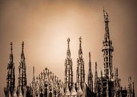 Dom van Milaan. Cattedrale Metropolitana della Natività della Beata Vergine Maria. De afbeelding toont een gedetailleerde close-up van een grootse gotische kathedraalgevel, weergegeven op een gestileerde, bijna cartooneske manier. Het gebouw is opgetrokken uit lichtgekleurde steen, met ingewikkeld houtsnijwerk, spitsbogen en talloze ramen met glas-in-lood.