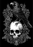 Een gedetailleerd en somber kunstwerk toont een raaf zittend op een schedel, omringd door kunstig ontworpen florale ornamenten. Het monochrome ontwerp geeft de afbeelding een mysterieuze en mystieke sfeer die de vergankelijkheid en schoonheid van het leven symboliseert.
