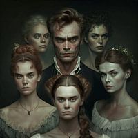 Een spookachtig portret van een piekerende man en vijf plechtig geklede vrouwen in historische kleding. Hun bleke gezichten, scherpe gelaatstrekken en doordringende blikken creëren een opvallend griezelige, gotische sfeer. De gedempte verlichting en het gedempte kleurenpalet brengen een gevoel van mysterie, spanning en onderliggend drama over. Elk personage lijkt diep verbonden en hun gezichtsuitdrukkingen stralen mysterie, onrust en onuitgesproken gevoelens uit. De historische setting, met zijn ingewikkelde kapsels en delicate stoffen, verwijst naar een verhaal over macht, passie en lotsbestemming. De compositie, gecentreerd rond de imposante figuur van de man, benadrukt de duistere romantiek en intrige die verweven zijn in deze griezelige, Victoriaanse geïnspireerde scène.