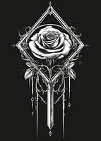 Dit artistieke motief toont een gedetailleerd getekende roos, die is ingebed in het midden van een geometrisch kader van gebogen ornamenten. De delicate lijnen en bloemelementen combineren harmonieus met de puntige, symmetrische vormen en vormen een fascinerend contrast met de donkere achtergrond. Het monochrome kleurenschema onderstreept de diepte en het elegante karakter van de illustratie, waardoor vooral de roos opvalt.