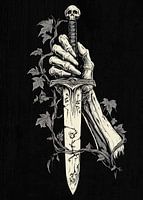 Dit artistieke motief toont een benige hand die een sierlijk zwaard stevig vasthoudt. De hand van een skelet grijpt het zwaard met indrukwekkende aandacht voor detail en geeft een zeer symbolisch tafereel weer. Het handvat van het zwaard is verstrengeld met ranken van klimop die elegant rond de kling kronkelen en de afbeelding een mystiek tintje geven. De pommel van het zwaard is versierd met een schedel, wat het donkere en mysterieuze karakter van het motief benadrukt. Tegen een diepzwarte achtergrond ontstaat een fascinerende combinatie van vergankelijkheid en kracht.