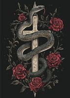 Een donkere en symbolische illustratie van een slang opgerold rond een sierlijk zwaard, omringd door rode rozen. De contrastrijke afbeelding combineert elementen van gevaar en schoonheid en creëert een mystieke, gotische sfeer die doet denken aan vergankelijkheid en passie.