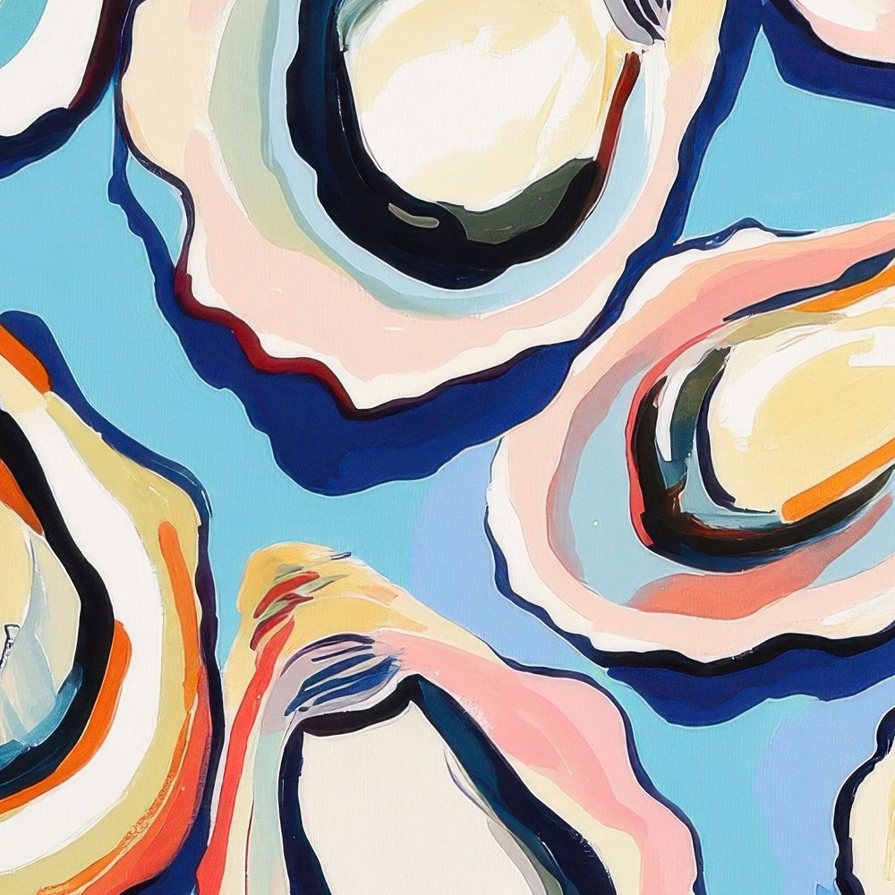 Een schilderij in met gouache verf van een patroon van oesters.