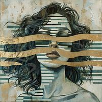 Goud Gestreept Portret | Goud en Strepen - Dit kunstwerk combineert een portret met abstracte elementen op een intrigerende manier, waar stroken goud het gezicht opbreken in secties tegen een achtergrond van afwisselend strepenpatroon. Het kleurgebruik is onderkoeld met hints van blauw, aarde en verweerd wit, wat resulteert in een gelaagde compositie die zowel modern als textuurgevoelig is.