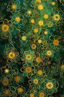 Dit werk toont een verzameling gouden bloemen tegen een diepe, donkergroene achtergrond. De bloemen lijken te dansen te midden van subtiele lijnen en stippen, wat een gevoel van beweging creëert. De combinatie van levendige bloemen en de rijke achtergrond zorgt voor een harmonieuze sfeer. Dit werk straalt natuurlijke schoonheid uit en is een perfecte aanvulling voor een woonruimte of kantoor waar een vleugje natuur en kleur gewenst is. Het voegt een dynamisch element toe dat zowel rustgevend als opwekkend werkt.