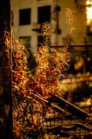 Warme tegenlichtglans tekent de sierlijke stengels en bladeren, terwijl het verweerde hekwerk en de vage gevel op de achtergrond een industriële context geven. Een beeld van natuur die terugkeert:…