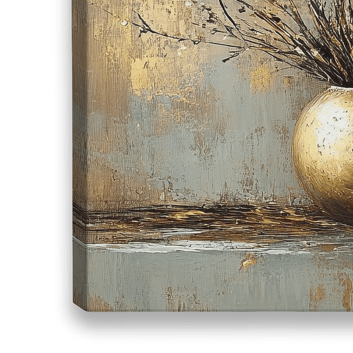Goud Stilleven - Dit stilleven schilderij illustreert drie gouden vazen en twee kleine gouden bollen, geplaatst op een rustiek houten oppervlak tegen een textuurrijke achtergrond van neutrale tinten, waaruit dunne, vertakte takken ontspruiten die een dynamisch contrast vormen met de gladde oppervlakken van de vazen.