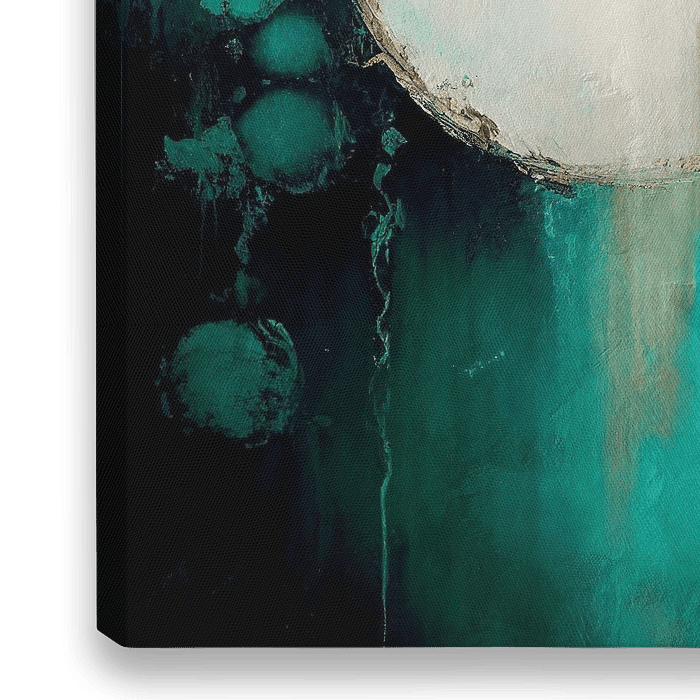 Abstract schilderij met cirkels en grove penseelstreken op grunge canvas in groen,teal,turquoise en goud tinten.