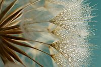 Goud - bruine pluisjes met kleine waterdruppeltjes met petrol kleurige achtergrond van Marjolijn van den Berg