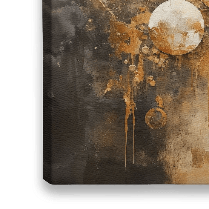 Een abstract schilderij in goud, beige, wit en bruin met cirkelvormige structuren straalt rust en elegantie uit. Dit abstracte kunstwerk brengt warmte, sereniteit en luxe samen en geeft de ruimte een harmonieuze uitstraling.