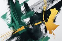 Brede donkergroene penseelstreken kruisen elkaar, terwijl sprankelende goudaccenten het beeld doorbreken. Zachte zwarte waaslagen geven diepte en beweging, in balans met royale witte ruimte die adem geeft. De compositie voelt energiek maar verfijnd, met vloeiende vormen en scherpe veeglijnen die elkaar afwisselen. Het contrast tussen…