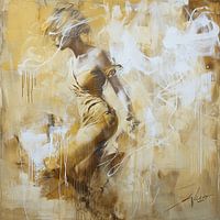 Goud - Dit levendige kunstwerk toont een gestileerde, gouden vrouwelijke figuur, zwevend tegen een expressieve, abstracte achtergrond vol beweging. De gouden en witte kleuren domineren, terwijl dynamische penseelstreken en verfspatten het geheel een energiek en modern gevoel geven.
