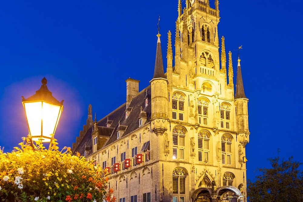 Gouda. Stadhuis op De Markt bij avondlicht.