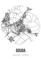 Zwart-witte landkaart, stratenplan of plattegrond van Gouda. Gouda is gelegen in de gemeente Gouda, provincie Zuid-Holland. Op de stadskaart zijn alle openbare wegen in Gouda opgenomen. Verder is de kaart voorzien van de coördinaten van het centrum van Gouda.
