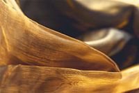 Dit abstracte werk toont een close-up van een lichte, transparante stof in een warme goudbruine kleur. De fijne textuur en zachte plooien van de stof worden gemodelleerd door het licht, waardoor een subtiel spel van schaduw, glans en diepte ontstaat. De compositie maakt volledig komaf met representatieve elementen en concentreert zich op het effect van materiaal, kleur en licht.