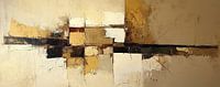 Gouden Abstract - Dit abstract schilderij kenmerkt zich door een harmonie van geometrische blokken en banden in tinten van goud, zwart en wit, die samen een kalme en evenwichtige compositie vormen, wat een gevoel van rust uitstraalt.