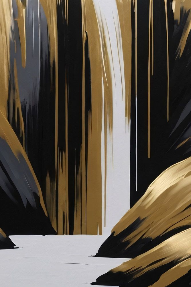 Dit stijlvolle kunstwerk toont een gedurfde en moderne interpretatie van een natuurlijk wonder: de waterval. Gecreëerd met een monochroom palet verrijkt met gouden accenten, symboliseert het ontwerp zowel kracht als sereniteit. De strakke lijnen en abstracte vormen zorgen voor een minimalistische uitstraling, waardoor het stuk een perfecte aanvulling is voor elk hedendaags interieur. Of het nu gaat om de rustige sfeer in een slaapkamer of de inspirerende omgeving van een kantoor, dit schilderij brengt een gevoel van kalme focus. De weerspiegeling van de waterval op het stille water beneden voegt een laag diepte toe die de toeschouwer uitnodigt om langer te kijken en te reflecteren.