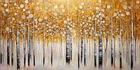 Een kleurrijk digitaal schilderij van een berkenbos. Dit werk is geïnspireerd door de vormen en het kleurenpallet van "De Kus". Het werk geeft een warme en klassieke uitstraling van uw interieur!
