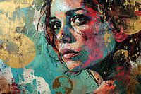 Gouden Blik - Dit expressieve werk vangt de blik met zijn dynamische samenspel van kleuren en texturen, waarbij de gelaagde vormen en het portret van een vrouw centraal staan. De stijl is krachtig urban art, waarin spatten goud en de tint kobaltblauw drama aan de compositie toevoegen. De levendige details, zoals de kwetsbaar lijkende blik en de strategisch geplaatste kleurvlekken, versterken het indringende karakter.