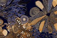 Dit werk toont een abstracte compositie van bloemen en organische patronen in gouden en blauwe tinten. De combinatie van delicate lijnen en stippen creëert een complex en intrigerend beeld dat diepte en textuur toevoegt. De patronen overlappen en verweven zich, wat een dynamisch en boeiend effect geeft.