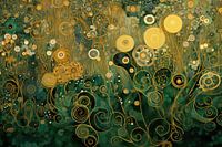 Dit werk toont een overvloed aan bloemen en spiralen in gouden tinten tegen een rijke groene achtergrond. De ranken en spiralen kronkelen door het beeld en geven een gevoel van beweging en levendigheid. Het contrast tussen de gouden bloemen en de diepe groene achtergrond zorgt voor een opvallende en harmonieuze compositie.