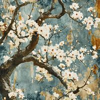 Gouden Bloesem - Dit levendige kunstwerk combineert de organische complexiteit van bloeiende takken met een verfijnd palet van blauw en aardetinten, verrijkt met gouden spatten die een luxueuze textuur toevoegen. De combinatie van floraal detail met ruige, donkere lijnen van de takken creëert een stijlvolle, natuurlijke elegantie, perfect aansluitend bij diverse inrichtingen van klassiek tot landelijk.