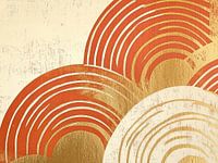 Gouden Bogen - Dit is een abstract schilderij met grote ronde bogen en concentrische cirkels in aardetinten, opvallend terracotta-oranje en glanzend goud op een crème achtergrond, een modern minimalistisch abstract schilderij met zichtbare textuur.
