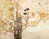 Gouden Boom - Het doek toont een gestileerde, abstracte weergave van een boom, met kronkelige takken en cirkelvormige patronen die doen denken aan sierlijke bladeren of bloemen. De gebruikte kleuren zijn overwegend warme goud- en aardetinten, verrijkt met accenten van blauw en een vleugje zwart, die een weelderige maar rustige sfeer…