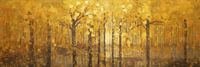 "Gouden Bos" straalt de warmte en pracht van een herfstig boslandschap uit. De bomen, badend in gouden licht, creëren een betoverende sfeer die de schoonheid van de natuur in dit seizoen perfect weergeeft. De lichtpuntjes en het gebruik van goudtinten geven het werk een sprookjesachtige uitstraling. De vloeiende lijnen en de organische vormen doen denken aan de Jugendstil, waar natuurlijke elementen op elegante wijze worden weergegeven. Dit werk is ideaal voor liefhebbers van herfst en natuur, en voegt een vleugje magie toe aan elk interieur.