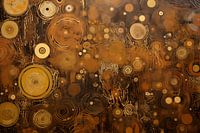 Dit werk toont een verzameling van cirkelvormige patronen in verschillende tinten goud en bruin. De overlappende en verweven cirkels creëren een gevoel van diepte en beweging. De compositie is geïnspireerd door natuurlijke vormen zoals boomringen en zandgolven, en brengt een rustige en warme sfeer.