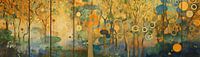 Gouden Cirkels Bos | Bosrijk Kunstwerk - Dit expressieve kunstwerk vangt de essentie van een betoverend boslandschap, gevangen in een dans van gouden en aardse tinten. De schilderstijl flirt met de grenzen van het abstracte en figuratieve, waarbij gestileerde bomen en speelse cirkels zich vermengen tot een dromerig geheel. Het meest in het oog springend zijn de weelderige gouden accenten die tussen de blauwgroene bladeren schitteren, waardoor een warme en uitnodigende sfeer ontstaat.