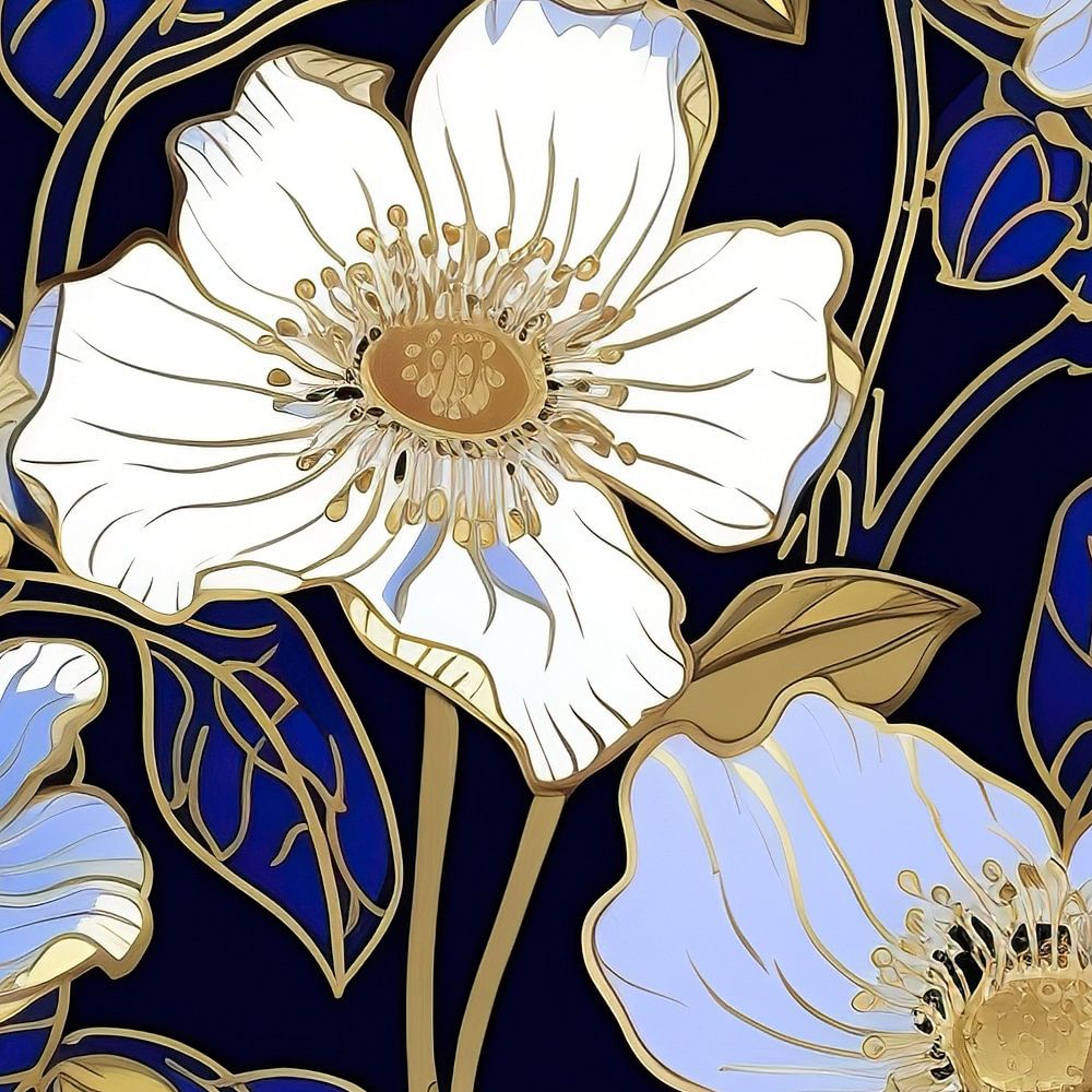 Gouden Flora - In dit gestileerde bloemenschilderij vangen de witte, uitvergrote bloemen meteen je aandacht tegen de donkerblauwe achtergrond. Goudkleurige details met een hint van lichtblauw benadrukken de delicate bloemblaadjes en sierlijke takken. De combinatie van organische vormen en een klassiek kleurenpalet ademt een tijdloze elegantie uit, waarmee het kunstwerk in diverse interieurstijlen tot zijn recht komt.