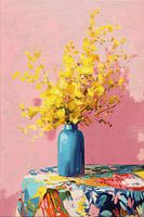 Een expressief kunstwerk waarin een turquoise vaas gevuld met uitbundige gele bloemen centraal staat tegen een zachte roze achtergrond. De vaas rust op een kleurrijk tafelkleed met een levendig patroon van bloemen en organische vormen in verschillende tinten blauw, geel en roze. De losse, dynamische penseelstreken geven het werk een…