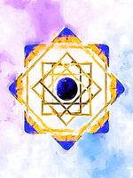 Deze mandala‑achtige geometrische compositie straalt harmonie en precisie uit. In het centrum bevindt zich een diepe blauwe kern, omringd door een gelaagd patroon van gouden vierkanten en driehoeken die naar buiten toe openbloeit als een ster. De zachte aquarelachtergrond in paars‑ en blauwtinten geeft het geheel een dromerige,…