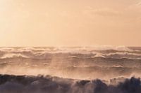 Deze adembenemende foto vangt de kracht en schoonheid van de oceaan op het moment dat het ochtendlicht de horizon verlicht. De golven, gehuld in gouden nevelen, dansen als dromerige sculpturen terwijl de wind de zee doet bruisen. De warme gloed van de zonsopgang contrasteert prachtig met de koele, schuimende golven, wat een sfeer van…