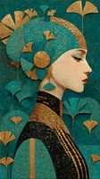 Een geraffineerde fusie van natuur en Art Deco geometrie. Dit digitale portret toont een elegant profiel versierd met een gestileerde hoofdtooi van Gingko Biloba bladeren - een klassiek symbool van het Art Deco tijdperk. Weergegeven in diep groenblauw en getextureerd bladgoud tegen een fluweelzwarte achtergrond, brengt dit kunstwerk een…