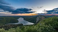 "Ervaar de serene grootsheid van Extremadura met dit indrukwekkende panoramische uitzicht over het Nationaal Park Monfragüe in Spanje. Deze hoogwaardige landschapsopname legt het magische moment vast waarop de zon achter de horizon zakt en de rivier de Taag (Tajo) verandert in een spiegel van zacht licht. De iconische rotsformaties van…