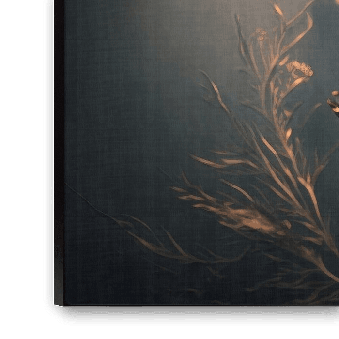 Het geheel straalt een rustige en introspectieve sfeer uit, die de kijker uitnodigt om dieper na te denken over de symboliek van de bloemen en de betekenis van de donkere achtergrond. Het schilderij lijkt te zinspelen op een mysterieus verhaal, dat wacht om ontdekt te worden.