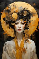 Prachtig mixed Media portret van een Aziatische dame. Met een gouden aureool en kimono. Een prachtig portret in een warme kleurcombinatie van goud, beige, oranje en zwart. Het kleurenpallet is geïnspireerd op de werken van Gustav Klimt.
