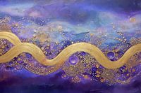 Dit werk toont een vloeiende gouden golf die zich uitstrekt over een diep paarse achtergrond. Rondom de gouden lijn zijn talrijke cirkelvormige patronen en stippen te zien, die een gevoel van beweging en textuur toevoegen aan het geheel. De combinatie van goud en paars creëert een rijke en luxueuze uitstraling.