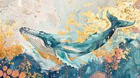 De walvis, weergegeven in verschillende tinten blauw, straalt sereniteit uit terwijl hij door een abstracte omgeving glijdt die bestaat uit gouden accenten en zachte, schilderachtige vegen. Het gebruik van goud suggereert een gevoel van luxe en mystiek, alsof de walvis in een oceaan van vloeibaar goud zwemt.