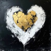 Het hart zelf is opgebouwd uit twee hoofdkleuren: een diep, rijk goud en een zuiver, levendig wit, beiden omlijst door een donkere, bijna zwarte achtergrond die de vormen doet opvallen.