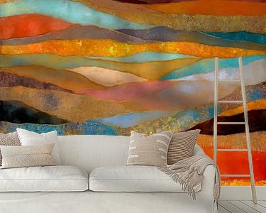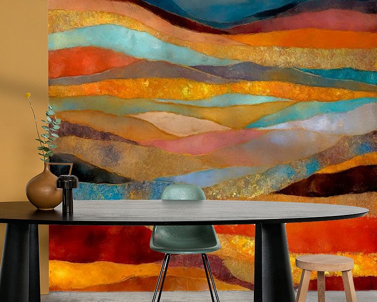 In dit werk vloeien heuvelachtige banen in warme tinten rood, oranje en goud in elkaar over. De lagen liggen als golven over elkaar heen en creëren een landschap dat zich in de verte uitstrekt. Tussen de warme kleuren verschijnen koelere accenten in blauw en turquoise, die diepte en rust brengen in de compositie.